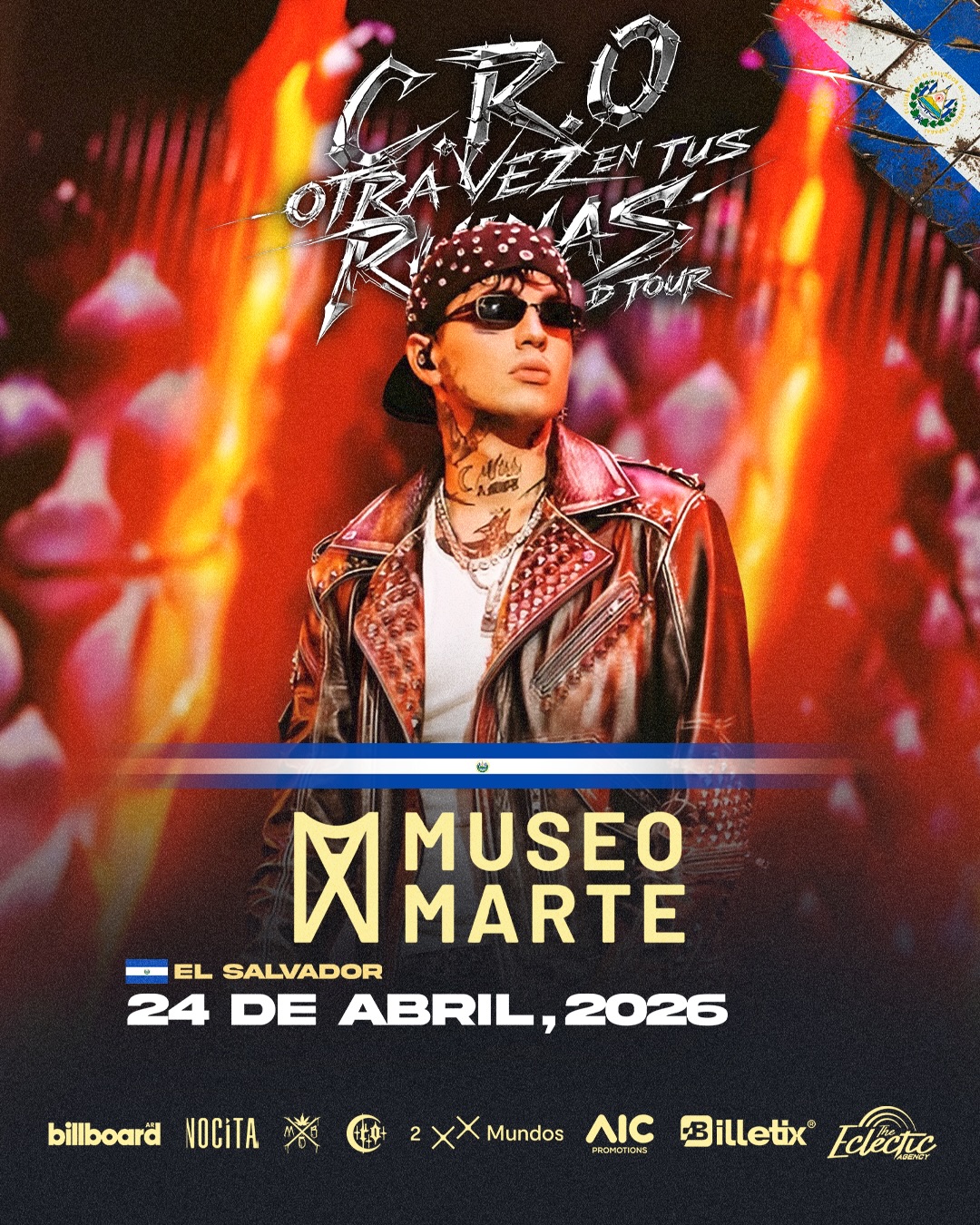 C.R.O + Añadir Google Calendar Exportación + iCal / Outlook Fecha Abr 24 2026 Finalizdo! Hora 8:30 pm - 11:55 pm Más Información Comprar Localización Museo de Arte de El Salvador Colonia San Benito, Final Avenida la Revolución, San Salvador Web http://www.museomarte.org/ Teléfono 22436099 Categoría Conciertos Organizador AiC Promotions Web http://aicpromotions.com Compartir este evento Buscar: Archivos Categorías No hay categorías
