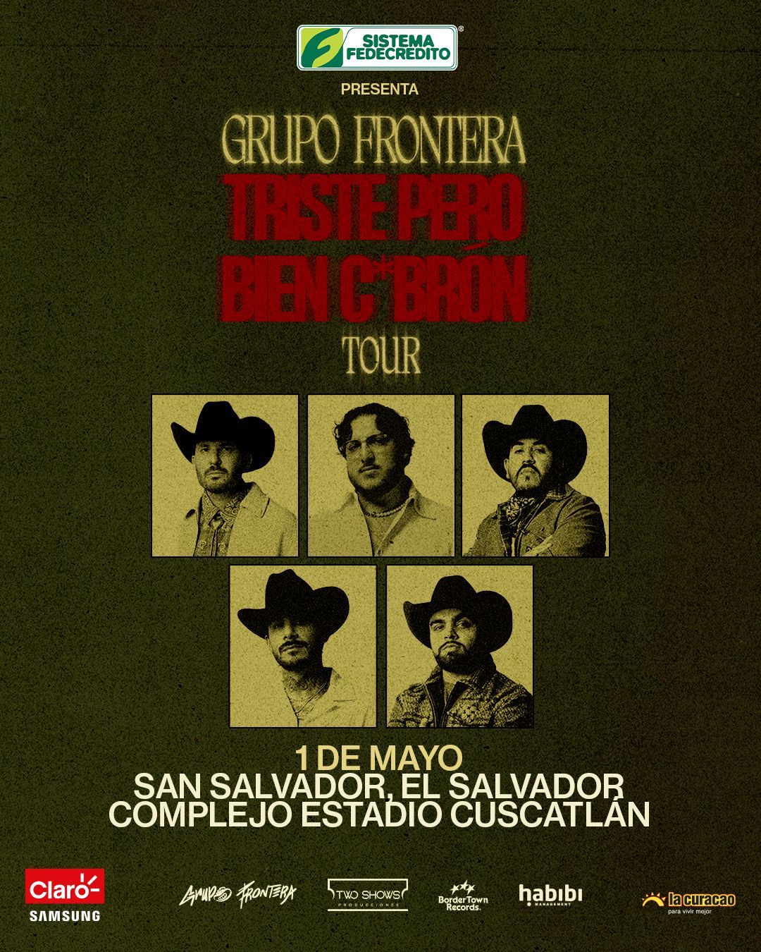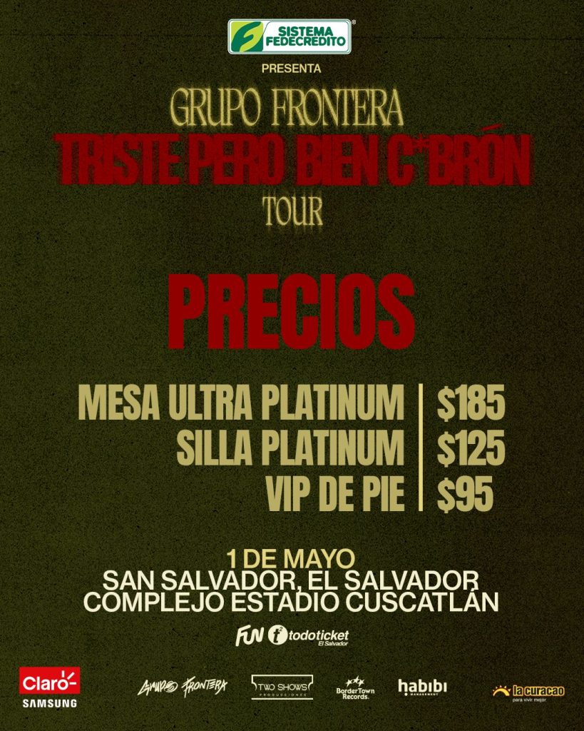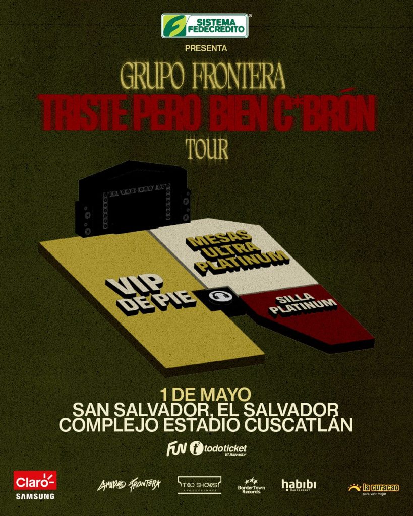 Grupo Frontera + Añadir Google Calendar Exportación + iCal / Outlook 00 días 00 horas 00 minutos 00 segundos Fecha May 01 2026 Hora 8:30 pm - 11:55 pm Más Información Comprar Localización Complejo Estadio Cuscatlán Blvr. Los Proceres, San Salvador Categoría Conciertos Organizador Two Shows Producciones Web https://twoshows.fun Comprar Compartir este evento Buscar: Archivos Categorías No hay categorías