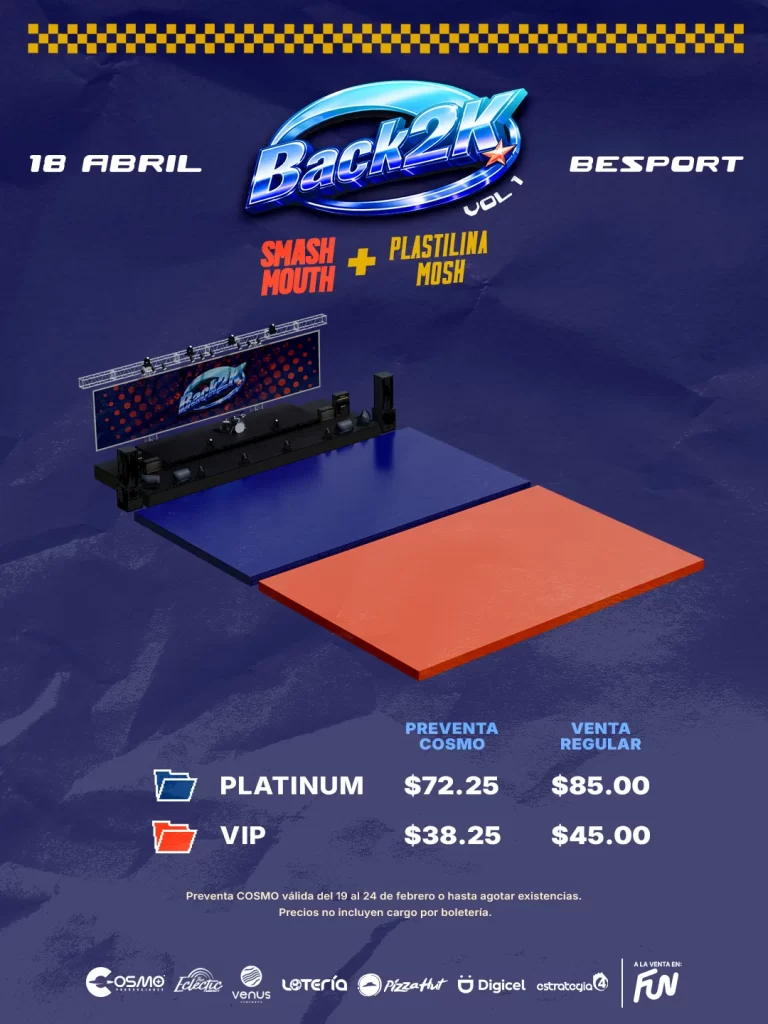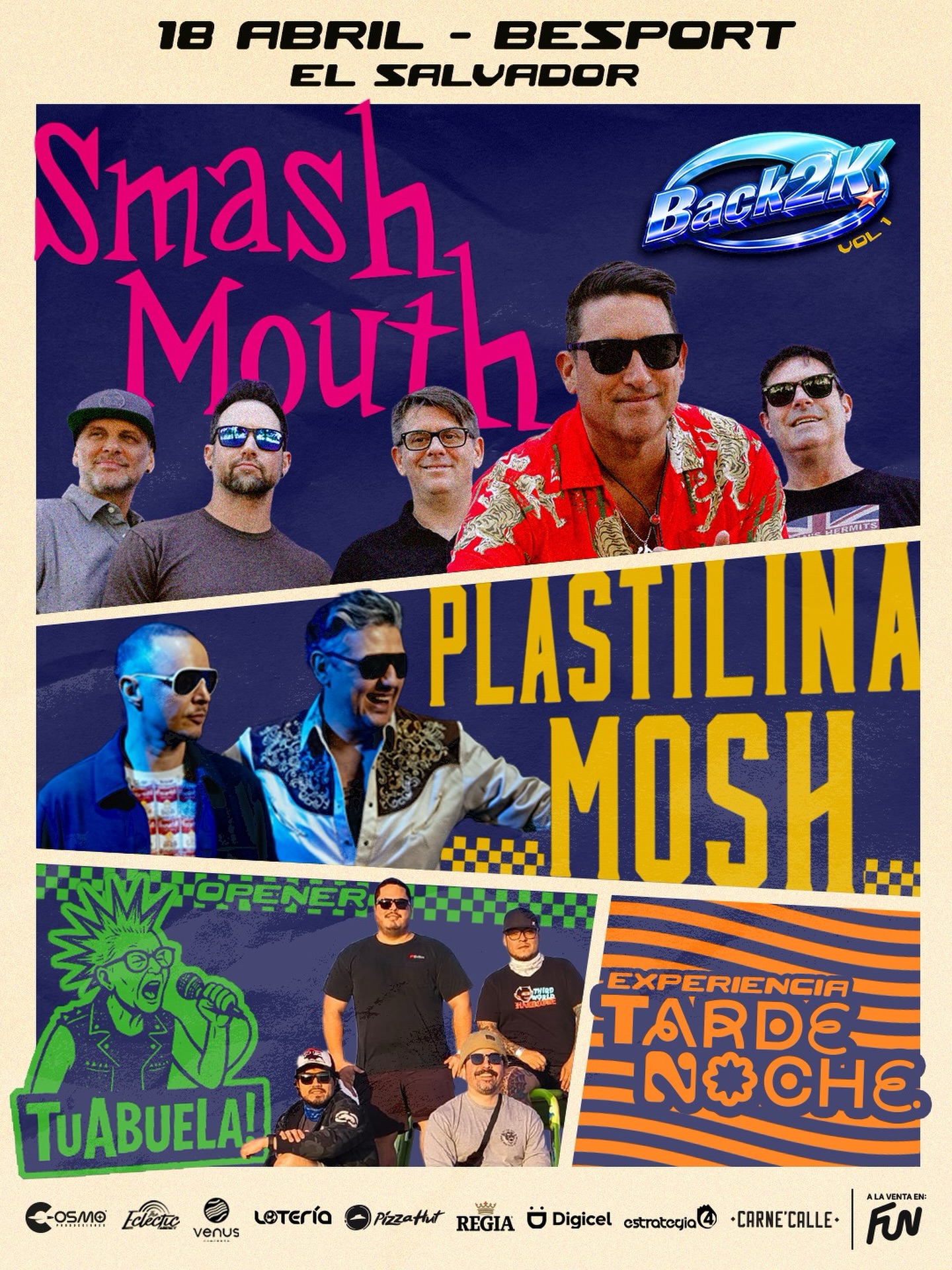 Smash Mouth + Añadir Google Calendar Exportación + iCal / Outlook 00 días 00 horas 00 minutos 00 segundos Fecha Abr 18 2026 Hora 8:30 pm - 11:55 pm Más Información Comprar Localización BeSport Carretera a Nuevo Cuscatlan, Nuevo Cuscatlán Web http://www.besport.sv/ Teléfono 75377718 Categoría Conciertos Organizador Cosmo Latam Comprar Compartir este evento Buscar: Archivos Categorías No hay categorías